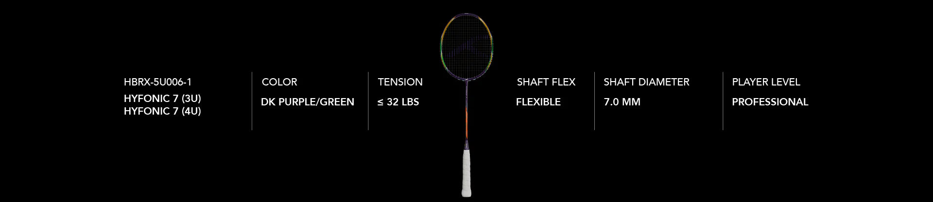 Hyfonic 7 responds with sharp, deliberate feedback on every stroke. The Dual Aerodynamic Frame keeps the shuttle steady through air, cutting drag both ways to support pinpoint shot direction. Torsion Stop Technology locks the frame from unwanted twists on impact, while CNTRL Foam cushions vibrations for a stable, composed hit. Reinforced with HyperWeave Carbon Fiber, Hyfonic 7 stays poised, even when the game isn’t.
